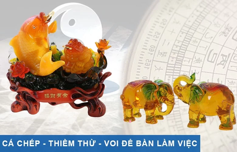 Linh vật cá chép - thiềm thừ - voi đặt trên bàn làm việc