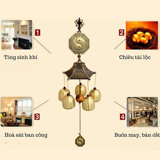 Chuông la bàn bát quái tức là chuông gió trên đó có in hình Bát Quái. Khi có luồng gió nào đi qua sẽ tác động tiếng chuông reo lên, đồng thời phát tán năng lượng Bát Quái giúp đánh đuổi những tà khí xung quanh.